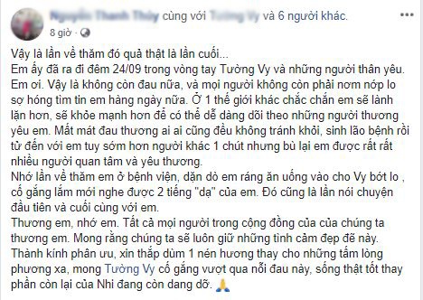Dù vẫn hiểu rằng sinh, lão, bệnh, tử không từ một ai, thế nhưng, chứng kiến Dương Nhi đã qua đời sau thời gian dài chiến đấu với bệnh ung thư thì Tường Vy không khỏi nghẹn ngào, thương cảm. Tường Vy chia sẻ, lúc này bản thân cảm thấy rất tuyệt vọng. Cứ nghĩ cuộc đời sẽ gặp được hạnh phúc bền lâu sau chuỗi ngày tháng bất hạnh, thế nhưng, mọi thứ đã không như mong ước.